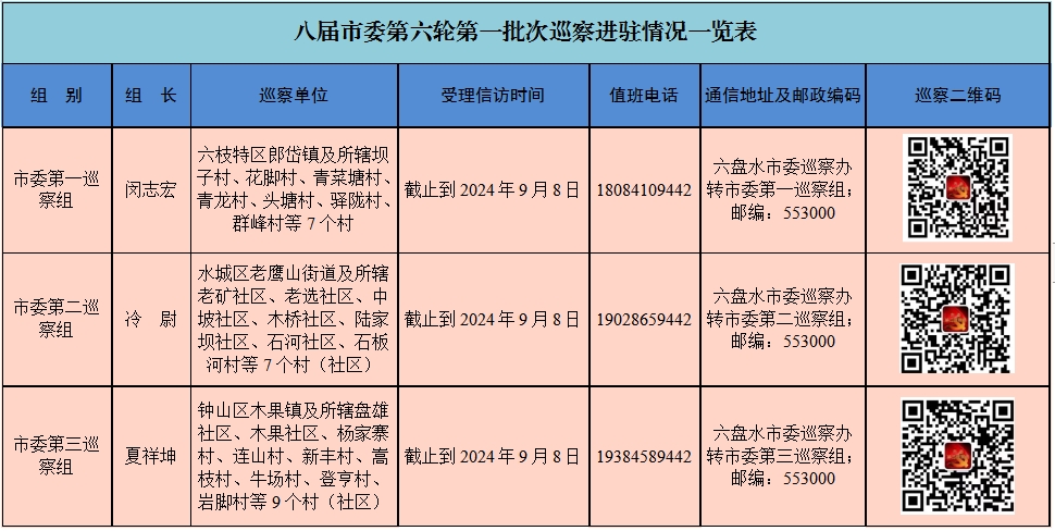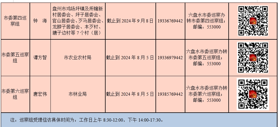 巡察期间,各巡察组设置值班电话和邮政信箱,发布巡察二维码,接受社会各界及广大干部群众对被巡察党组织存在问题的举报反映和监督,主要受理被巡察党组织领导班子及其成员、村(社区)两委班子成员和其他重要岗位领导干部违反政治纪律、组织纪律、廉洁纪律、群众纪律、工作纪律、生活纪律方面的举报和反映。其它不属于巡察受理范围的信访问题,将按规定转被巡察单位和有关部门处理。巡察市林业局、市农业农村局受理信访时间截止到2024年8月5日,巡察4个乡(镇、街道)及所辖30个村(社区)受理信访时间截止到2024年9月8日。